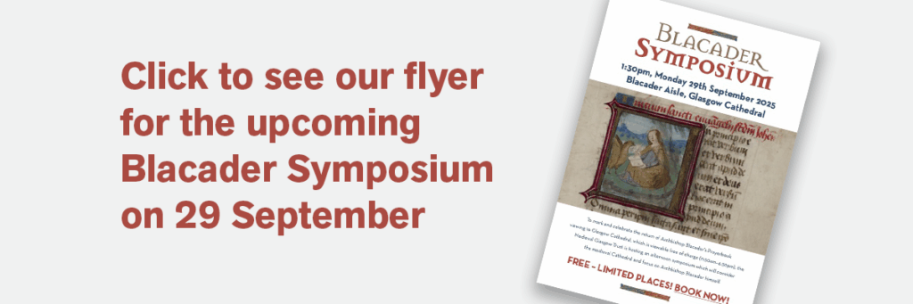 In the afternoon of the 29th, the Mediaeval Glasgow Trust is organising a Symposium in celebration of the Prayerbook’s visit and to mark Glasgow’s 850. This event will take place in the aisle that Archbishop Blacader commissioned for the Cathedral and will run from 13:30 to around 16:40, ending with a final opportunity to view the Prayerbook in the Cathedral nave.